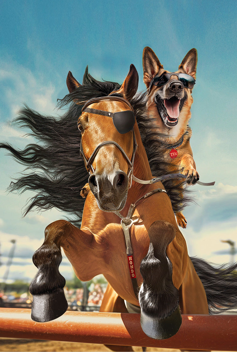 Meet Hondo, the proud one-eyed Andalusian stallion with the spirit of a warrior and the wisdom of the open range. By his side is Tex, the loyal, tail-wagging German Shepherd who brings equal parts bravery and goofball charm. Together, they lead the beloved cast of ranch characters at Rancho Hondo — where sunrise chores, dusty boots, and unconditional love for animals shape every single day.